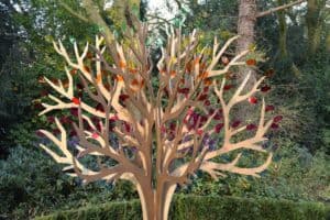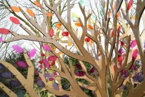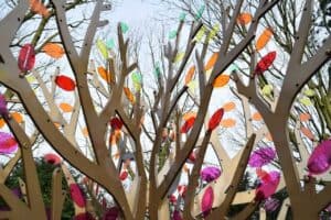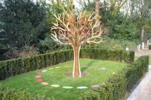 Der Name des Sternenkindes ist in ein transparentes Gedenkblatt eingraviert und am Baum aufgehängt. Die Blätter sind in den sieben Farben des Regenbogens gehalten.