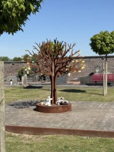 Der Gedenkbaum aus Cor-Ten-Stahl ist 220 cm hoch und steht auf einem Sockel mit Cor-Ten-Stahlkante.