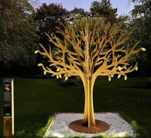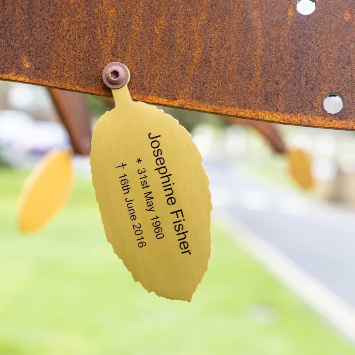 Der Stahlbaum ist 3,2 Meter hoch und 3 Meter breit und wurde so gestaltet, dass er nach dem Oxidieren in warmen Herbstfarben erstrahlt. Die Gedenkblätter selbst bestehen aus goldfarben eloxiertem Aluminium und können beidseitig graviert werden.